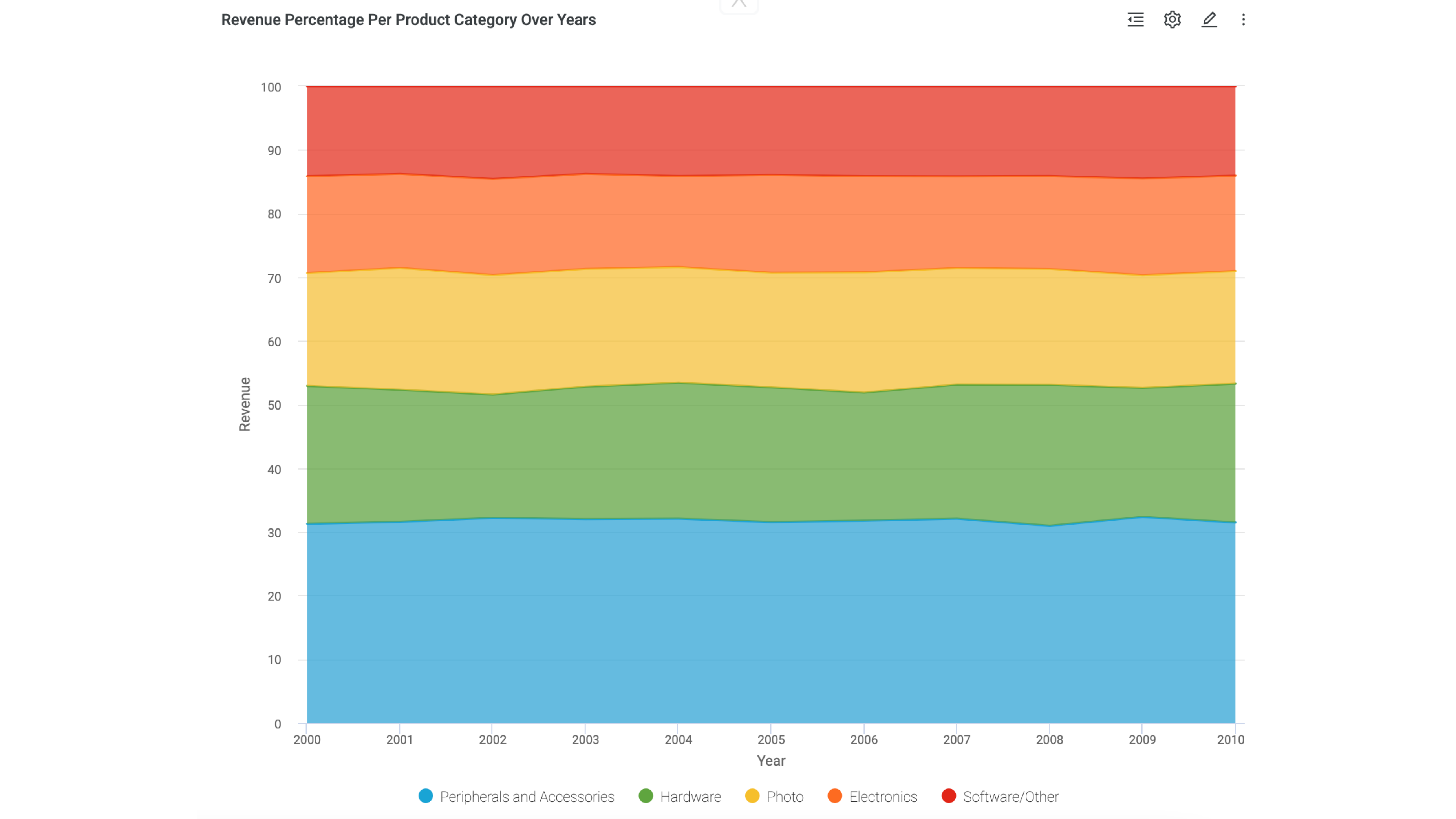 - Name the insight Revenue Percentage Per Product Category Over Years.